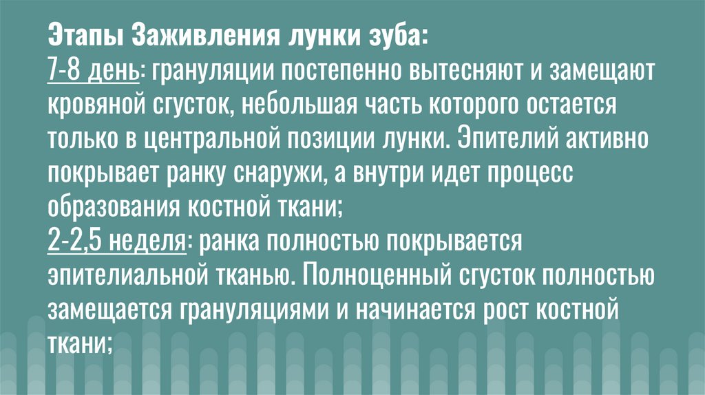 Этапы Заживления лунки зуба:7-8 день: грануляции постепенно вытесняют и замещают