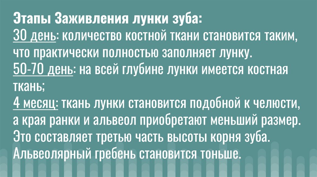 Этапы Заживления лунки зуба:30 день: количество костной ткани становится таким,