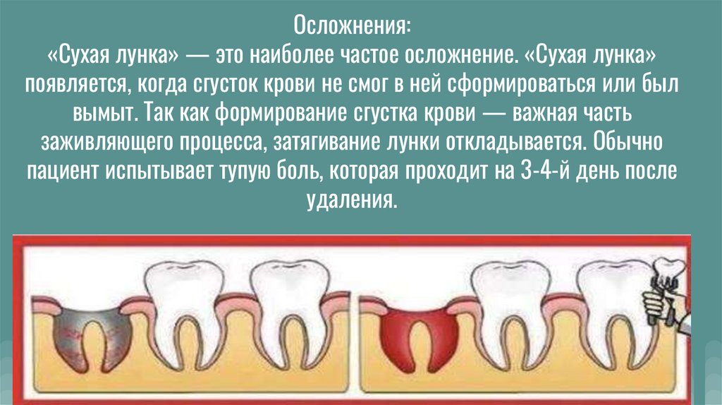 Осложнения:«Сухая лунка» — это наиболее частое осложнение. «Сухая лунка»