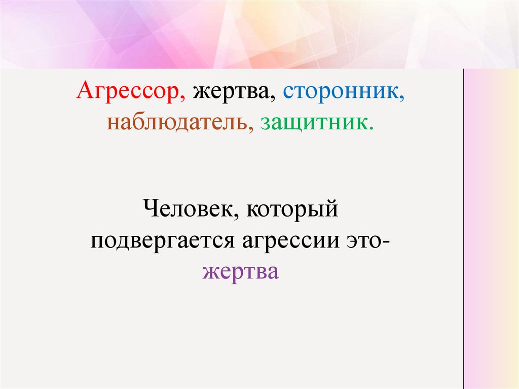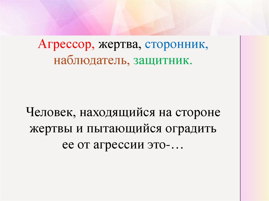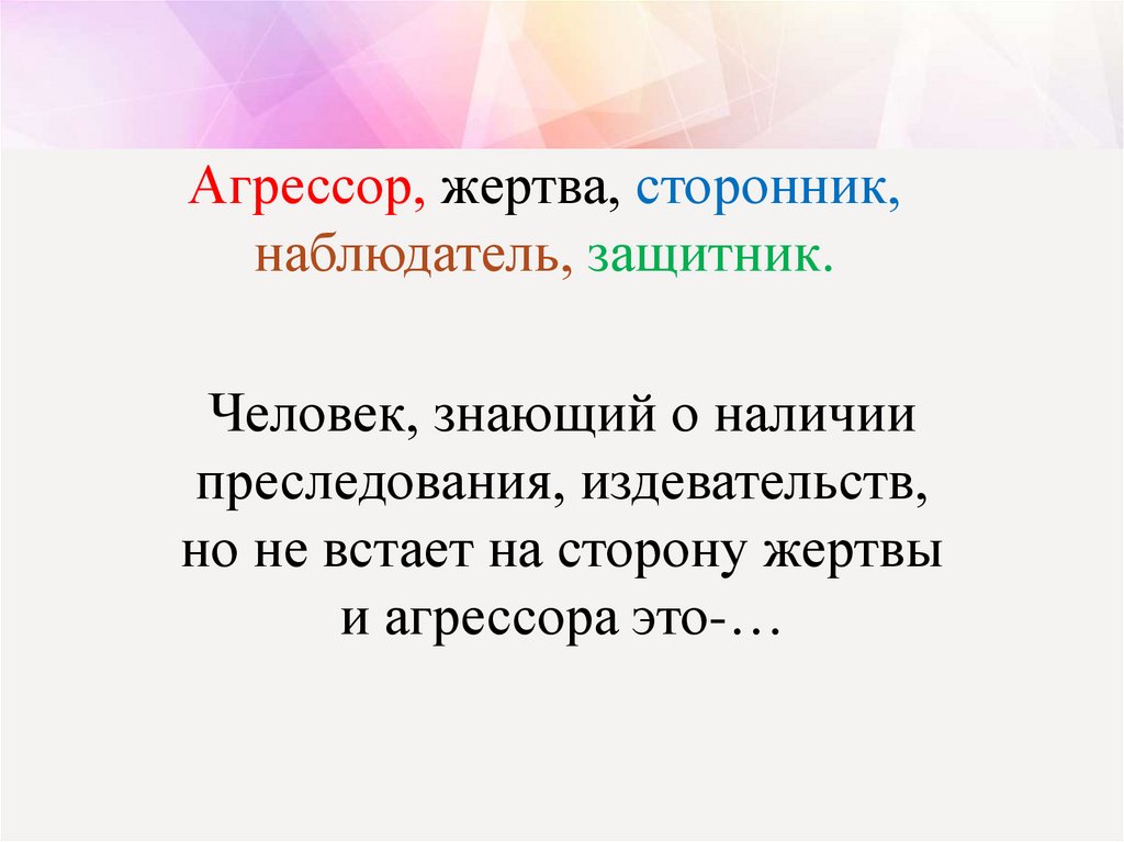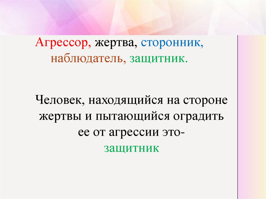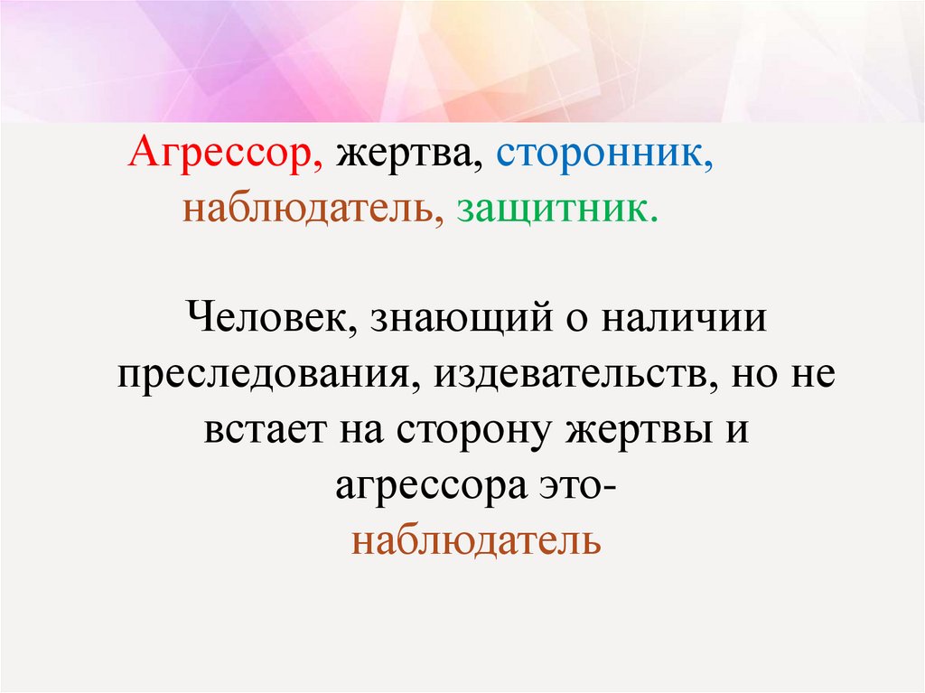 Агрессор, жертва, сторонник,наблюдатель, защитник.