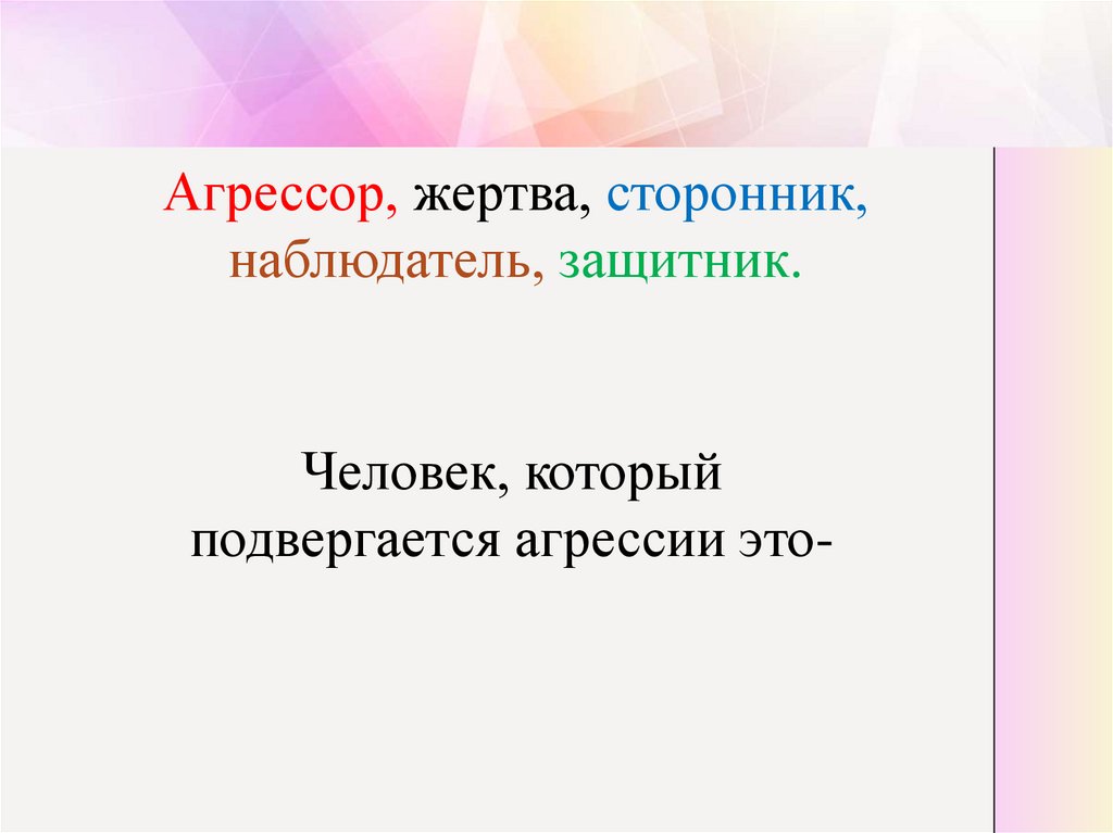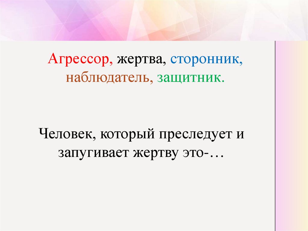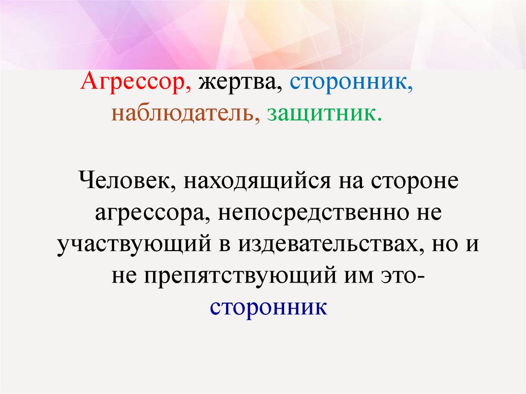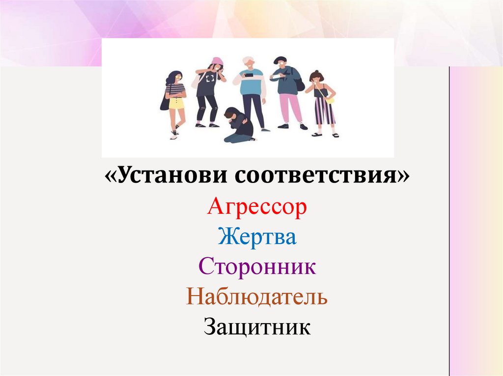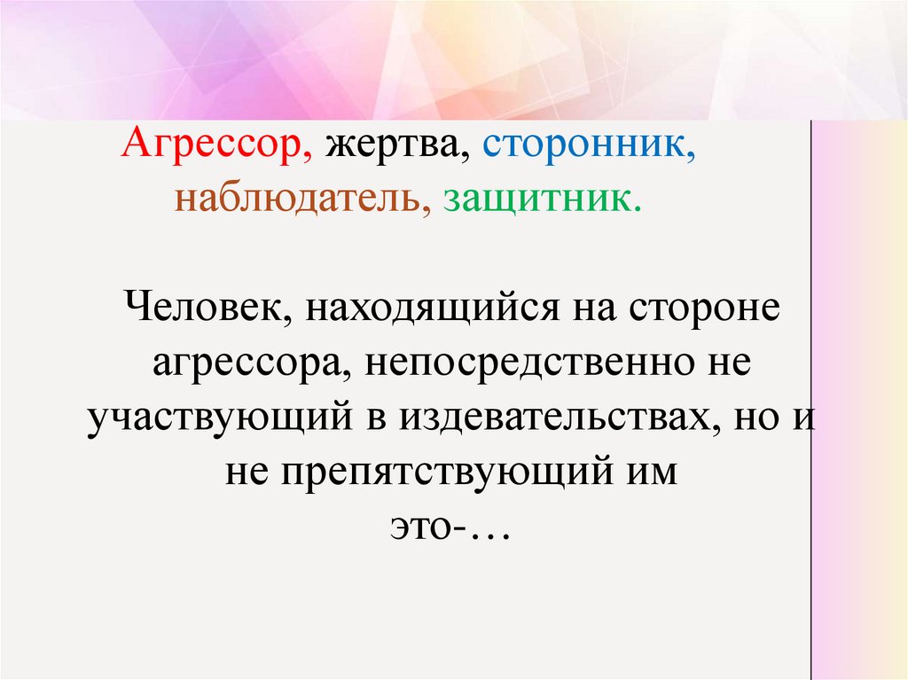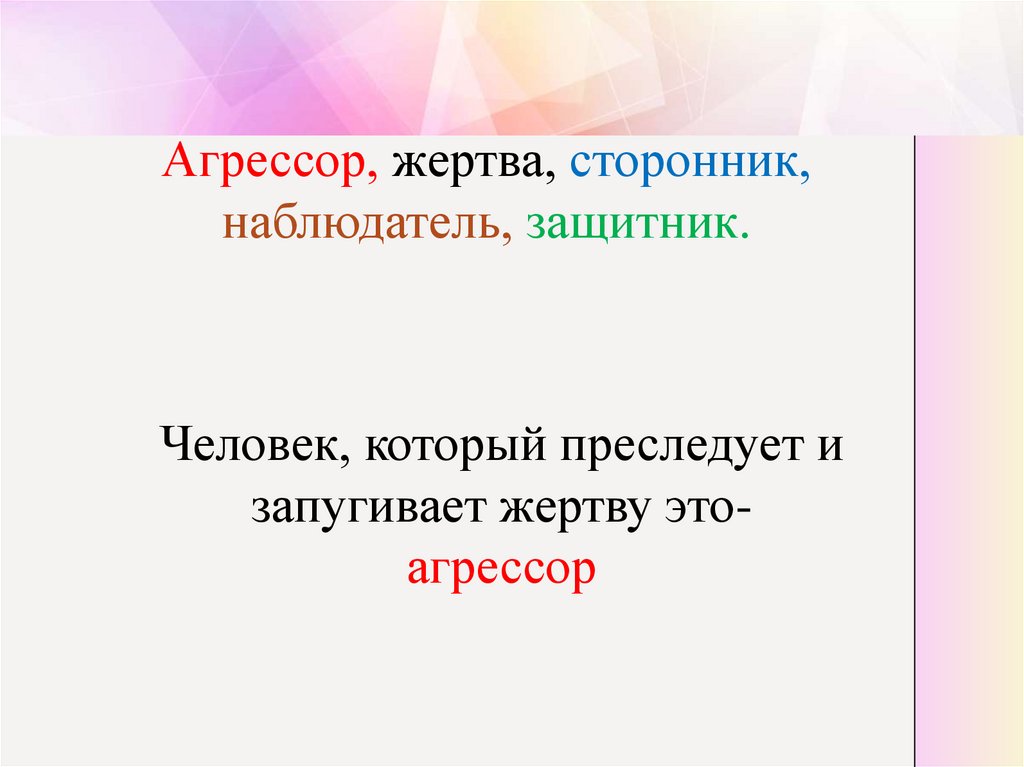 Агрессор, жертва, сторонник,наблюдатель, защитник.
