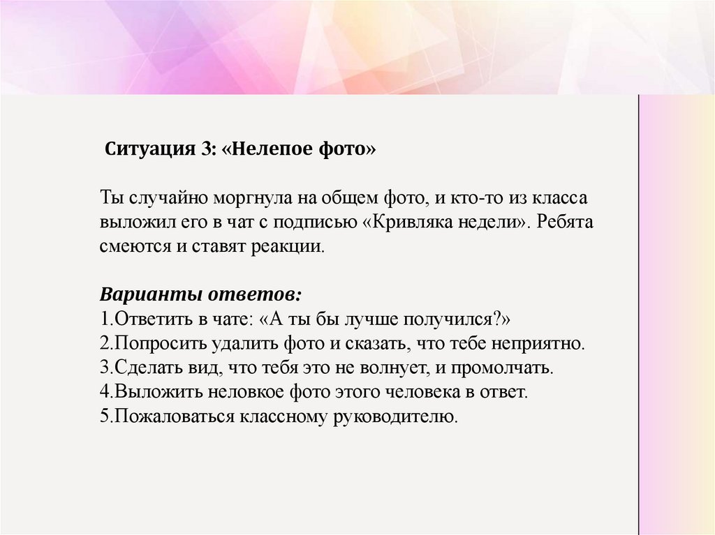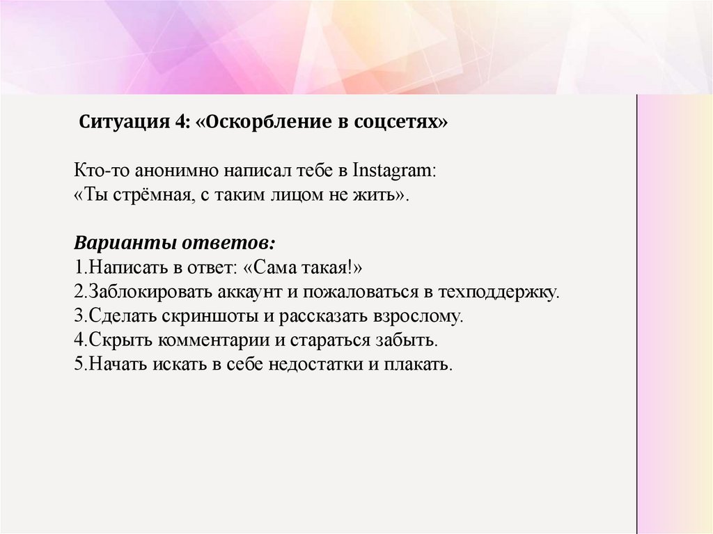 Ситуация 4: «Оскорбление в соцсетях»Кто-то анонимно написал тебе в Instagram:
