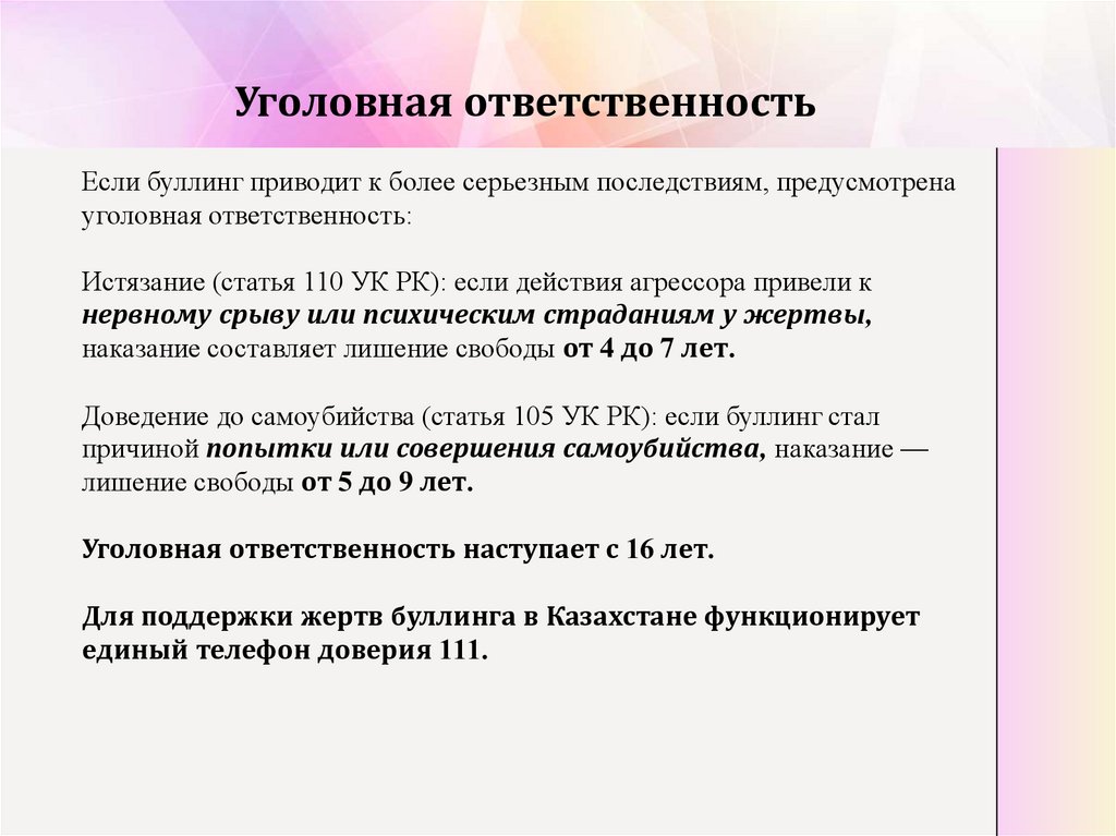 Уголовная ответственностьЕсли буллинг приводит к более серьезным последствиям, предусмотрена