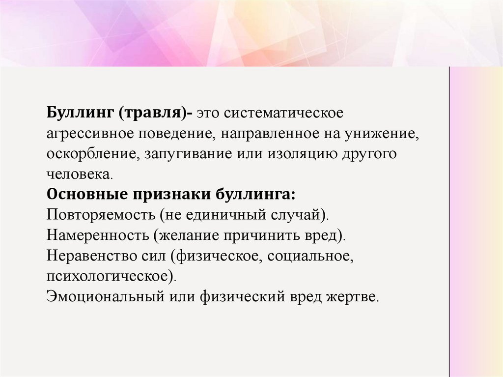 Буллинг (травля)- это систематическоеагрессивное поведение, направленное на унижение,