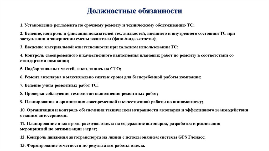 Должностные обязанности1. Установление регламента по срочному ремонту и техническому обслуживанию ТС;