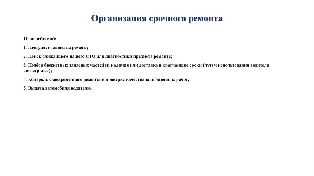 6. Ремонт автопарка в максимально сжатые сроки для бесперебойной работы компании;