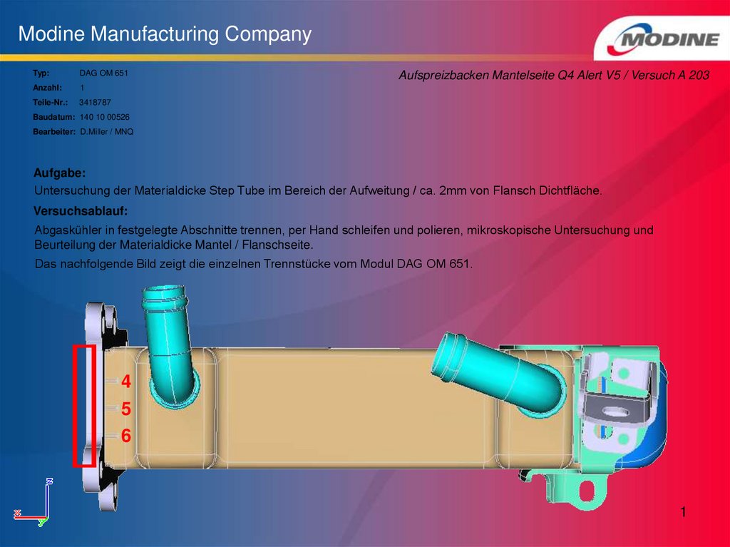 Abgaskühler in festgelegte Abschnitte trennen, per Hand schleifen und polieren, mikroskopische Untersuchung und