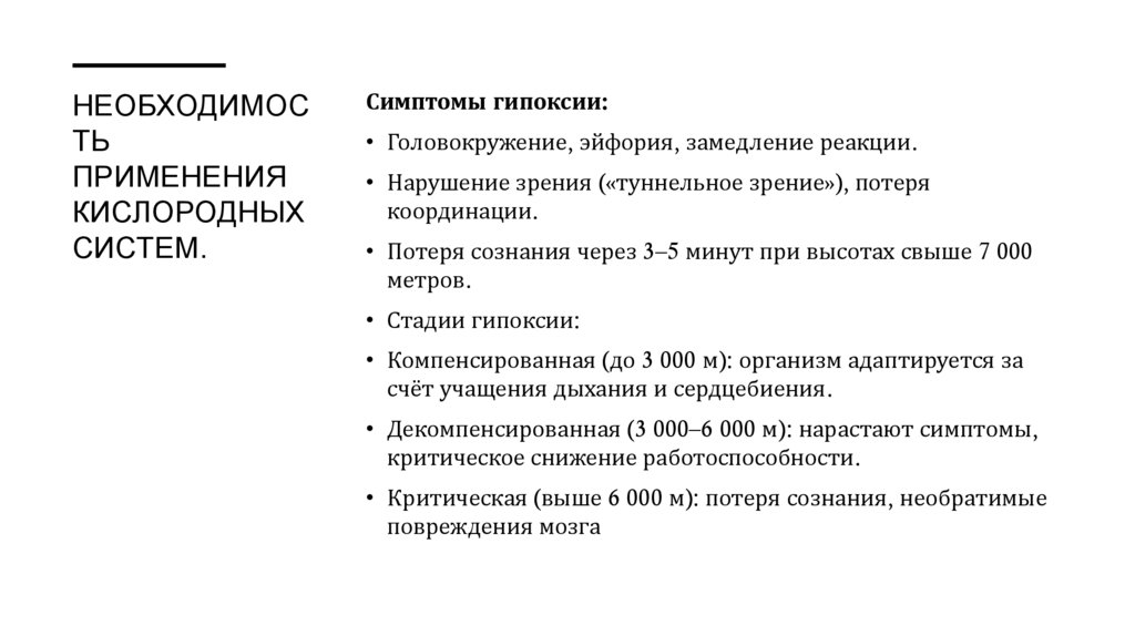 • Потеря сознания через 3–5 минут при высотах свыше 7 000