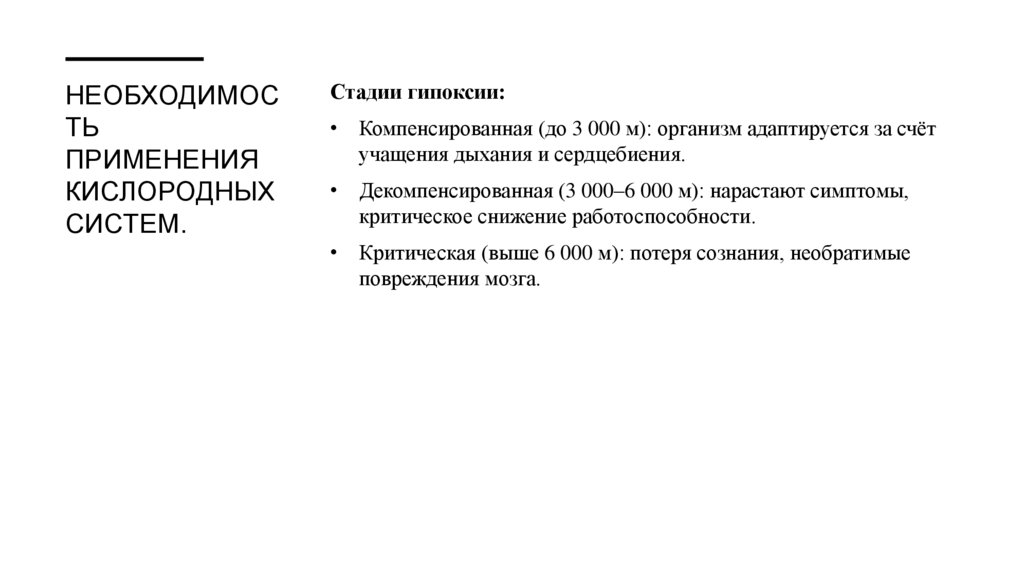 • Декомпенсированная (3 000–6 000 м): нарастают симптомы,