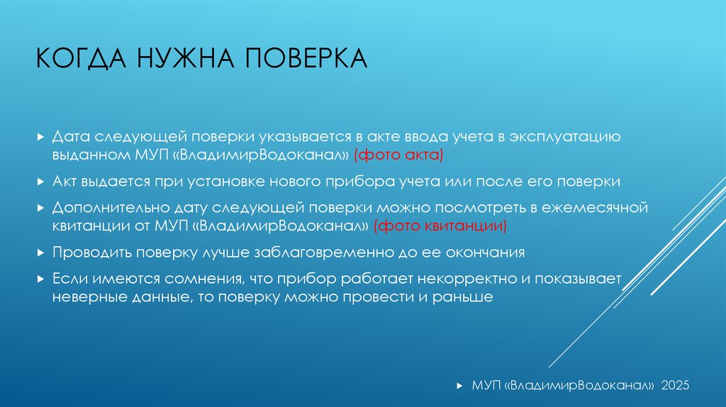 КОГДА НУЖНА ПОВЕРКАДата следующей поверки указывается в акте ввода учета в эксплуатацию