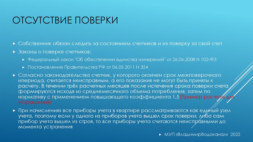 ОТСУТСТВИЕ ПОВЕРКИСобственник обязан следить за состоянием счетчиков и их поверку за свой счет