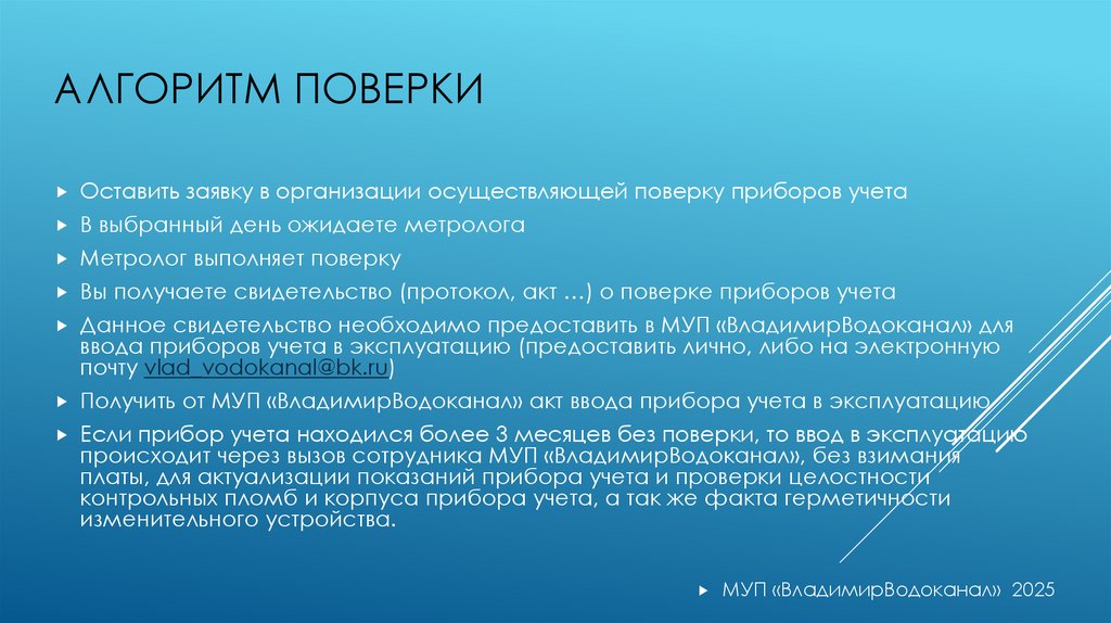 происходит через вызов сотрудника МУП «ВладимирВодоканал», без взимания