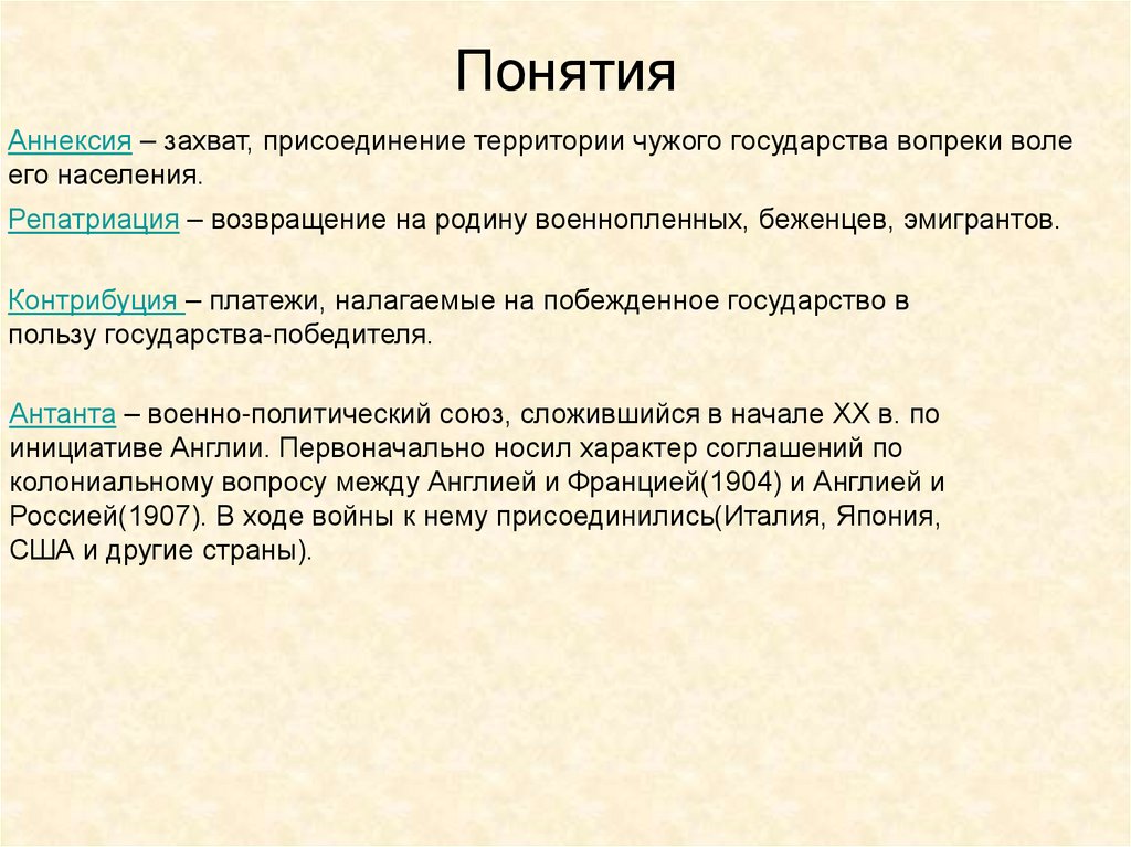 Аннексия – захват, присоединение территории чужого государства вопреки волеего населения.