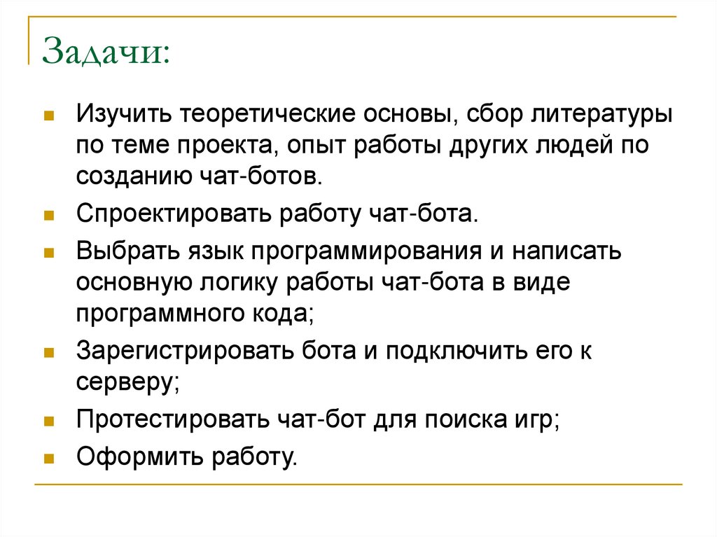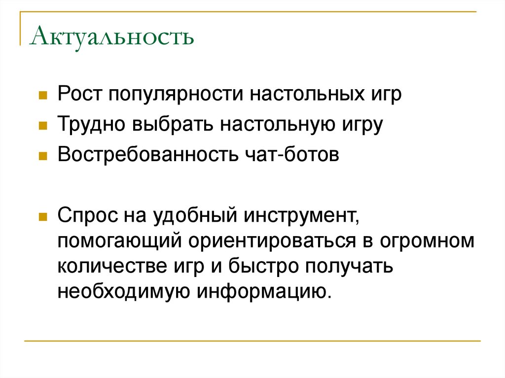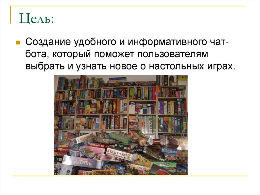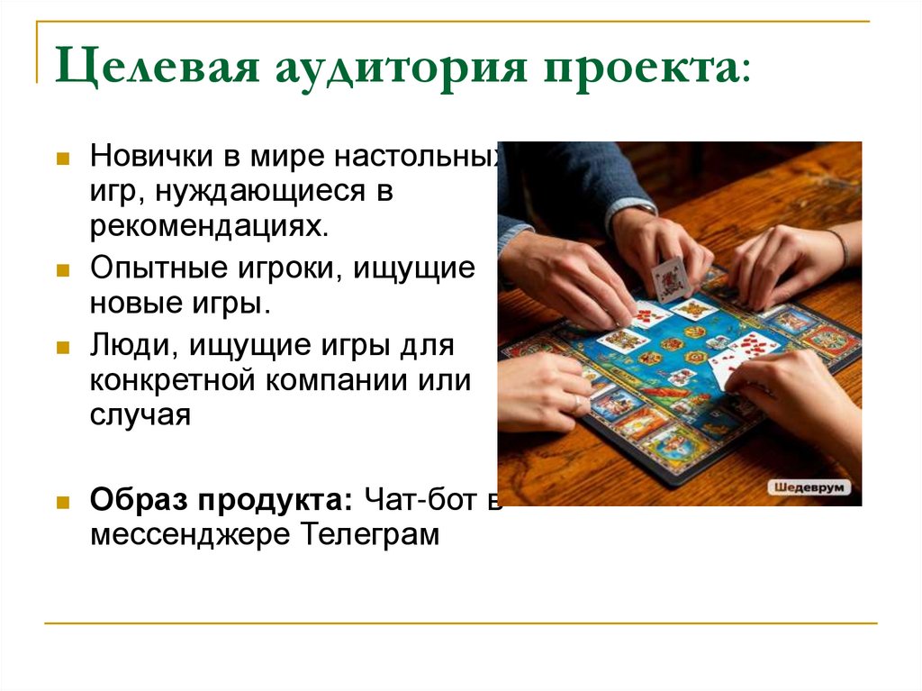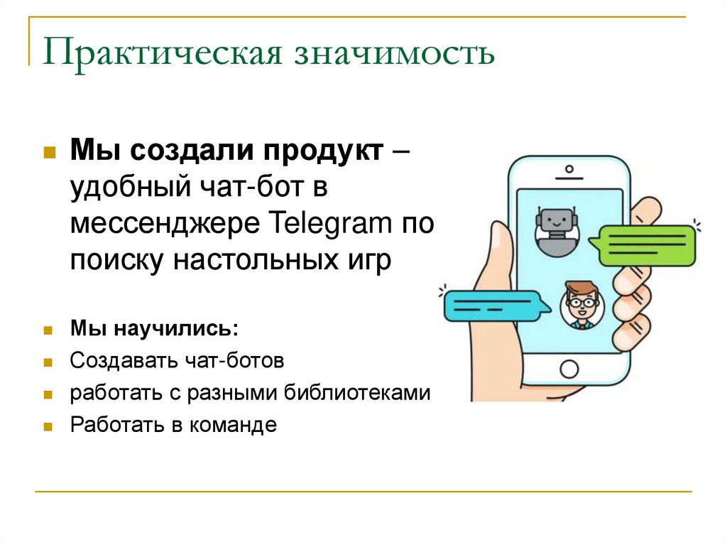 Создание удобного и информативного чатбота, который поможет пользователямвыбрать и узнать новое о настольных играх.