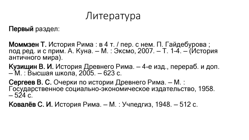 Первый раздел:Моммзен Т. История Рима : в 4 т. / пер. с нем. П. Гайдебурова ;