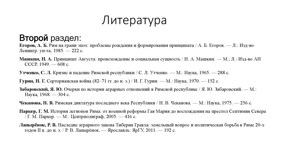 Второй раздел:Егоров, А. Б. Рим на грани эпох: проблемы рождения и формирования принципата / А. Б. Егоров. — Л.: Изд-во