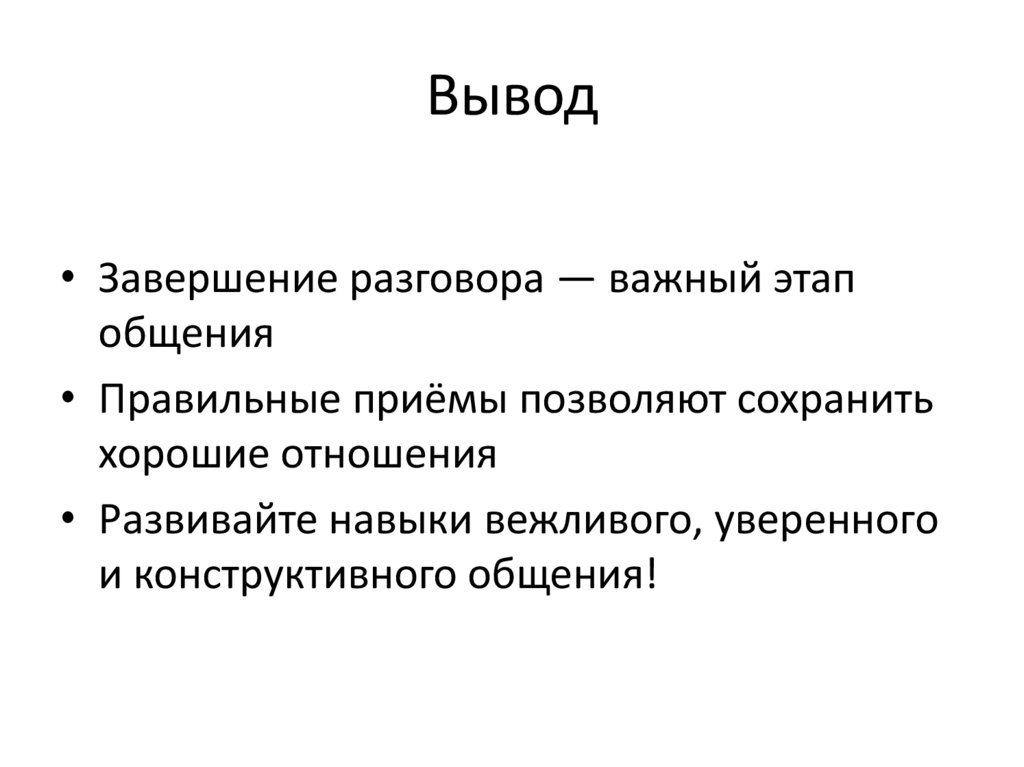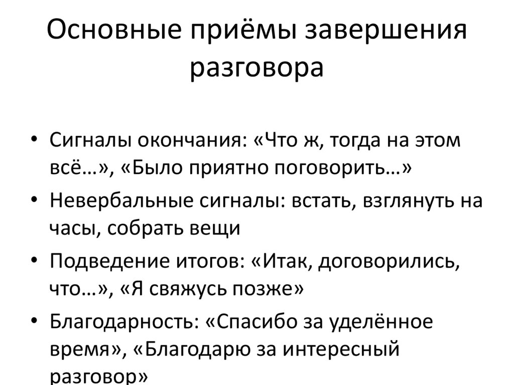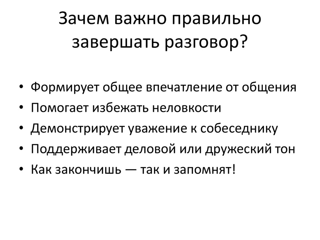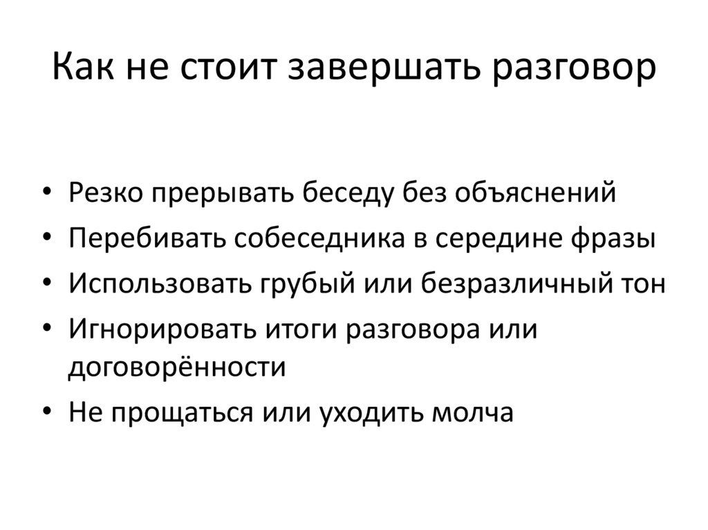 Как не стоит завершать разговор• Резко прерывать беседу без объяснений