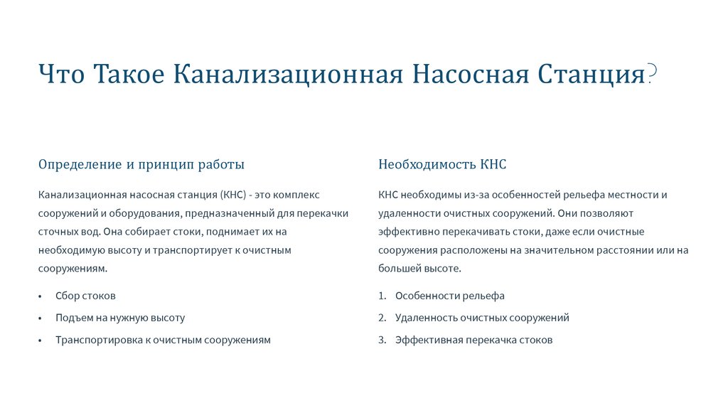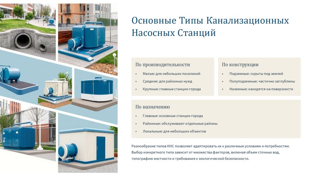 обеспечивают перекачку сточных вод, что необходимо для поддержания санитарноэпидемиологического благополучия города. Мы рассмотрим различные типы КНС,
