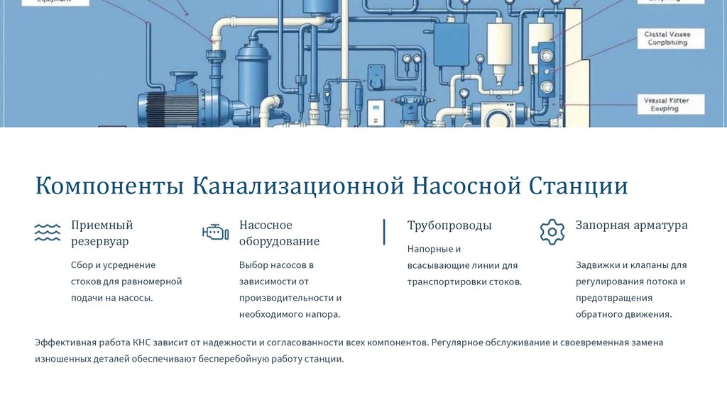 Эффективная работа КНС зависит от надежности и согласованности всех компонентов. Регулярное обслуживание и своевременная замена