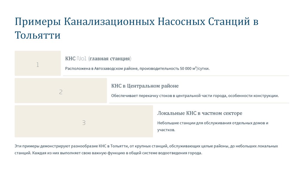 Эти примеры демонстрируют разнообразие КНС в Тольятти, от крупных станций, обслуживающих целые районы, до небольших локальных
