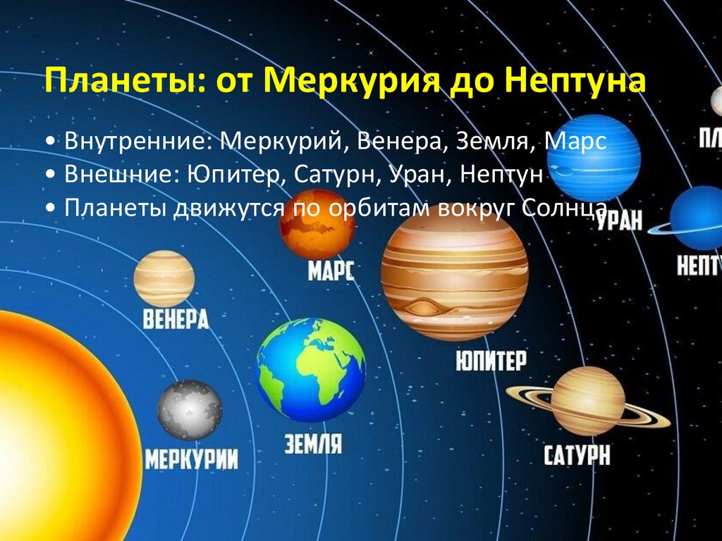 Планеты: от Меркурия до Нептуна• Внутренние: Меркурий, Венера, Земля, Марс