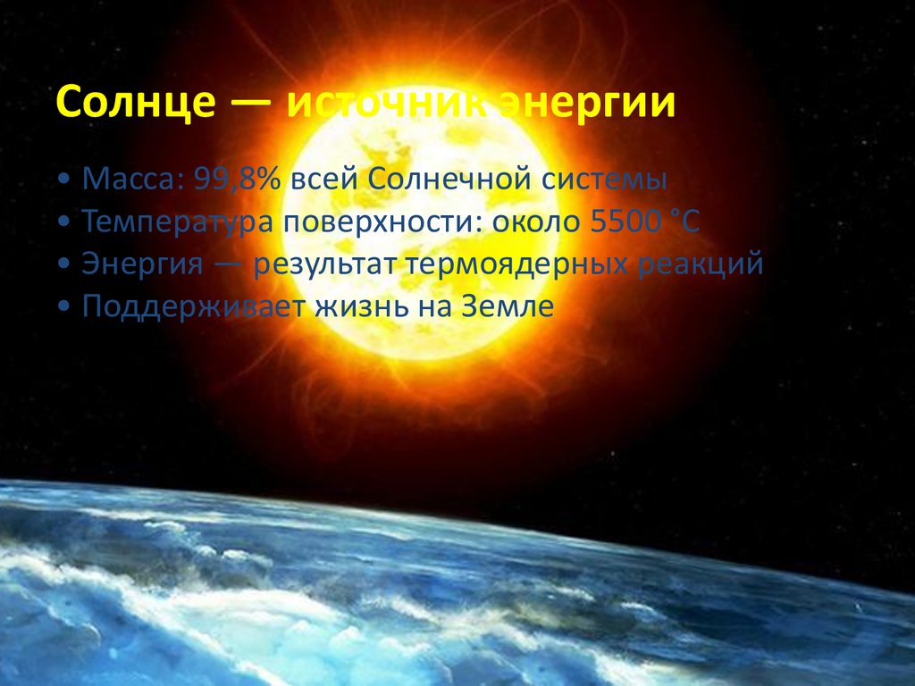 Солнце — источник энергии• Масса: 99,8% всей Солнечной системы