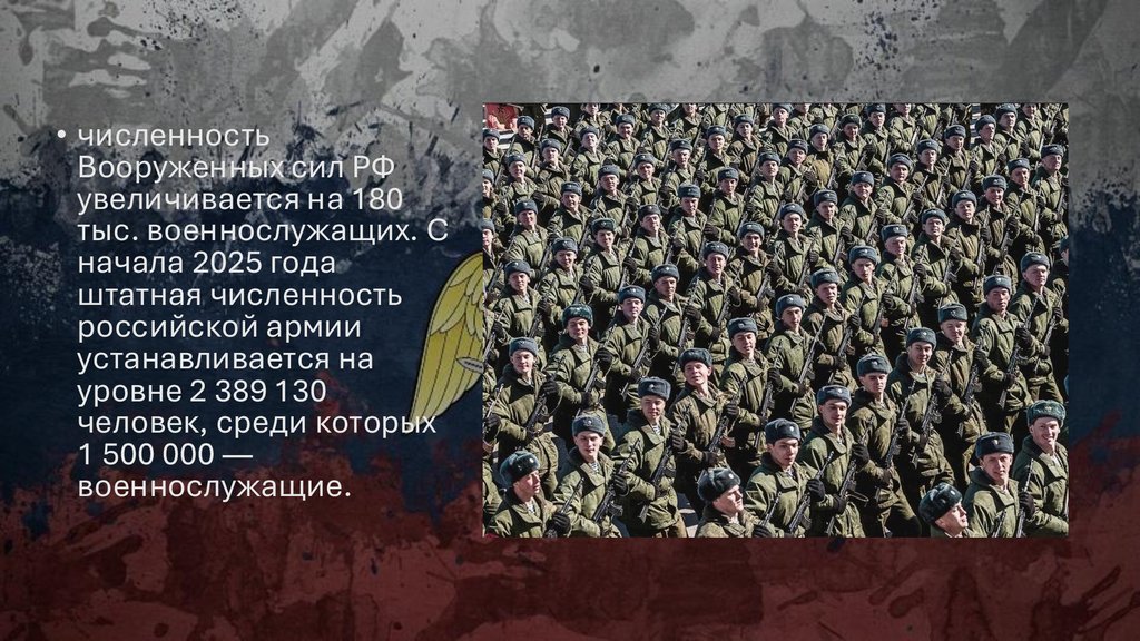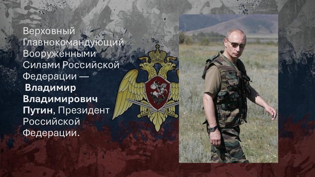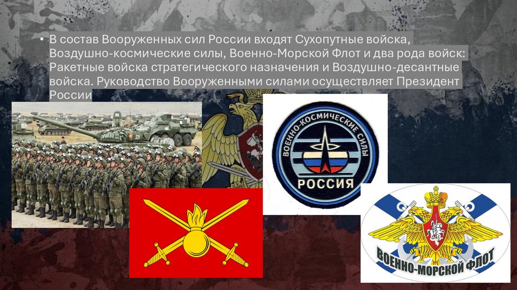 • В состав Вооруженных сил России входят Сухопутные войска,Воздушно-космические силы, Военно-Морской Флот и два рода войск:
