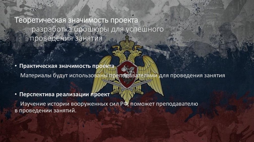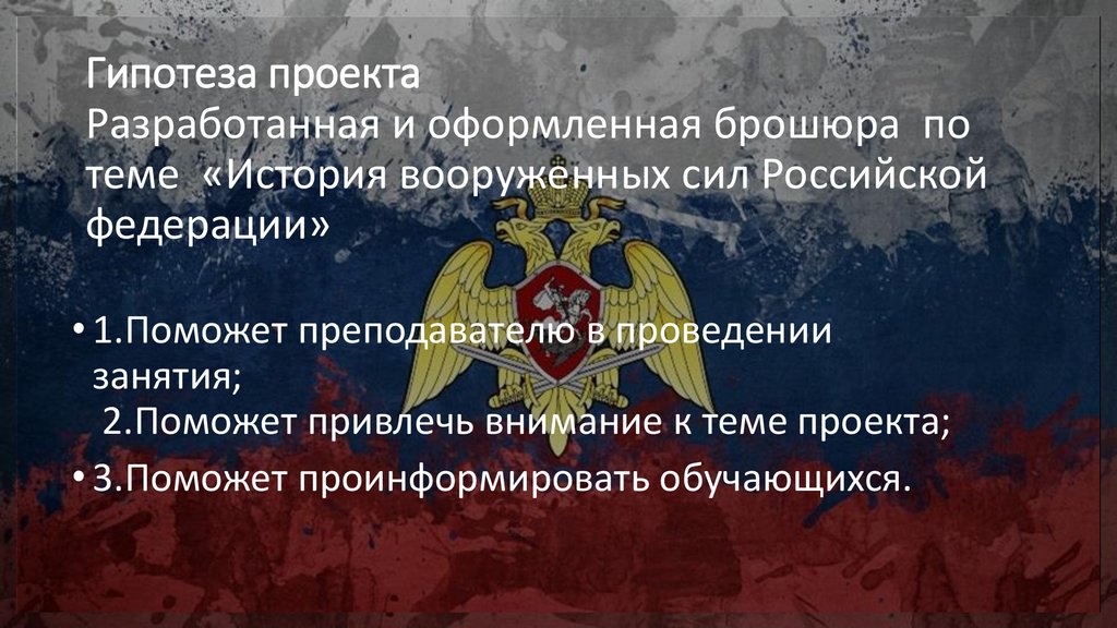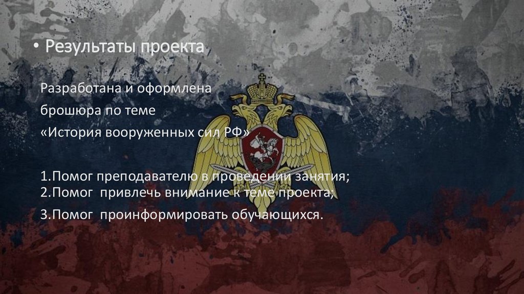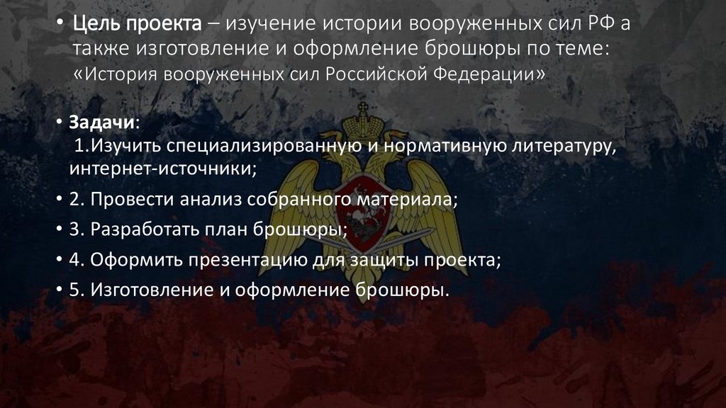 • Цель проекта – изучение истории вооруженных сил РФ атакже изготовление и оформление брошюры по теме: