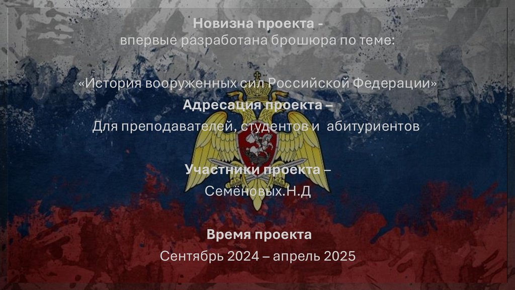 Новизна проекта впервые разработана брошюра по теме:«История вооруженных сил Российской Федерации»