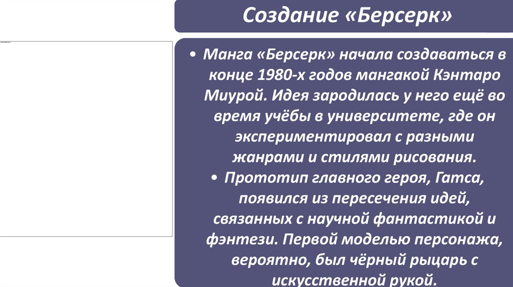 Создание «Берсерк»• Манга «Берсерк» начала создаваться в