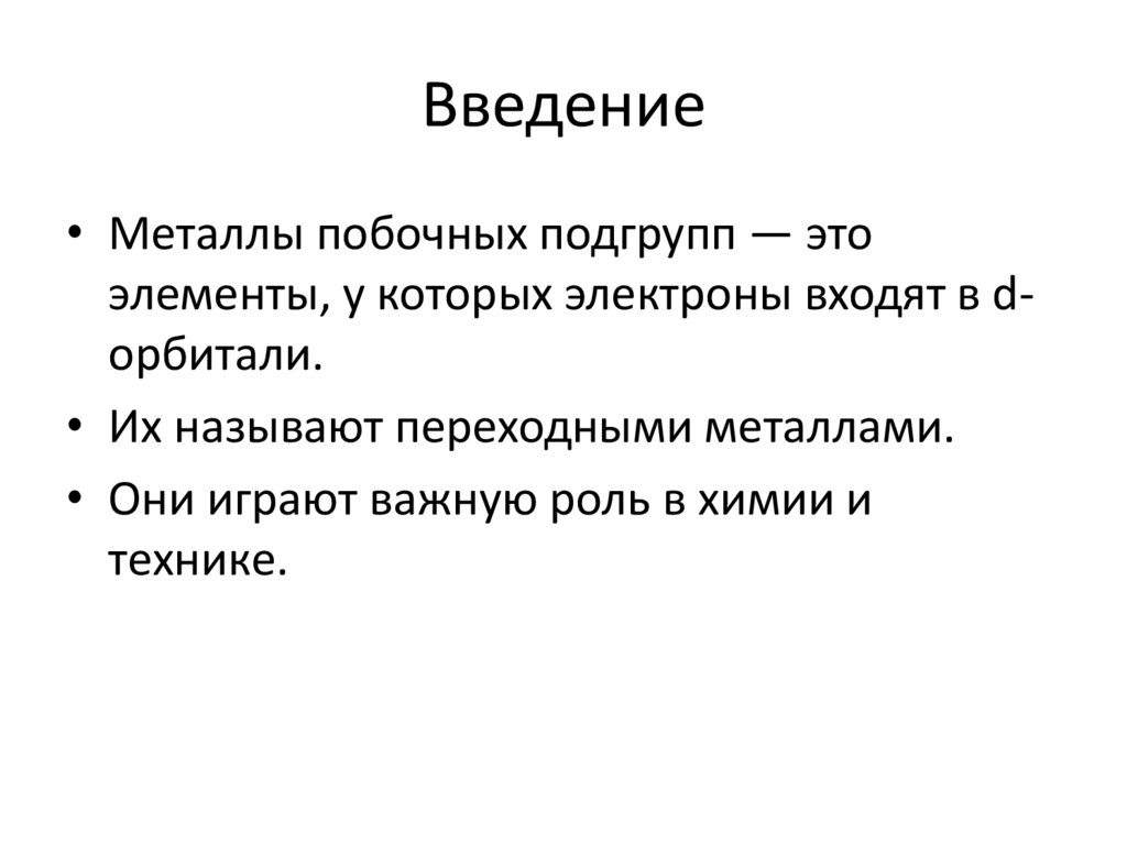Введение• Металлы побочных подгрупп — это