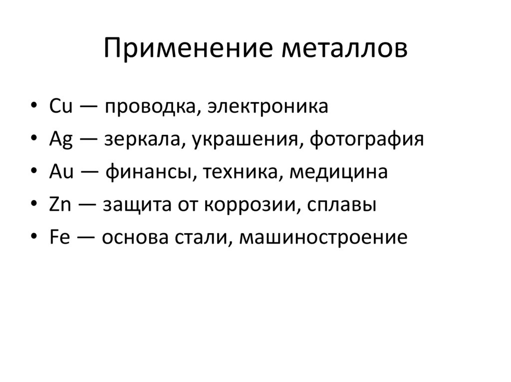 Применение металлов• Cu — проводка, электроника