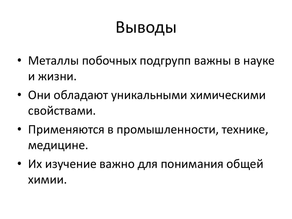 Выводы• Металлы побочных подгрупп важны в науке