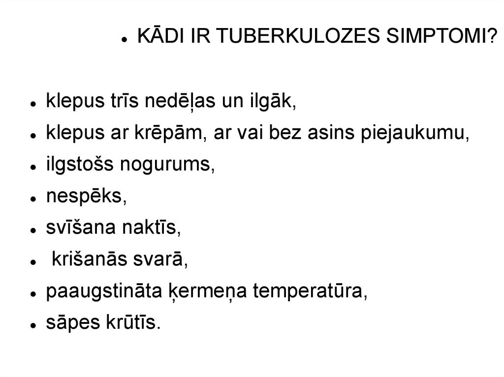 KĀDI IR TUBERKULOZES SIMPTOMI?klepus trīs nedēļas un ilgāk,