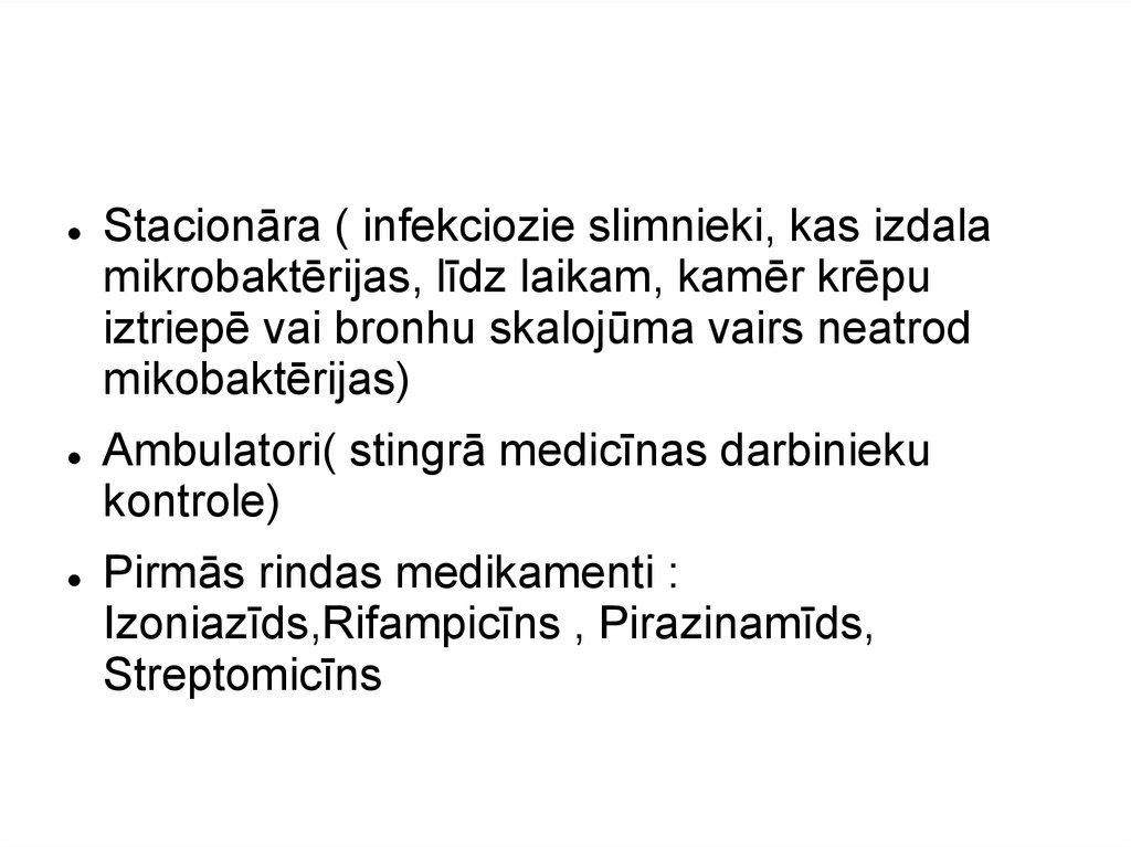 Stacionāra ( infekciozie slimnieki, kas izdalamikrobaktērijas, līdz laikam, kamēr krēpu