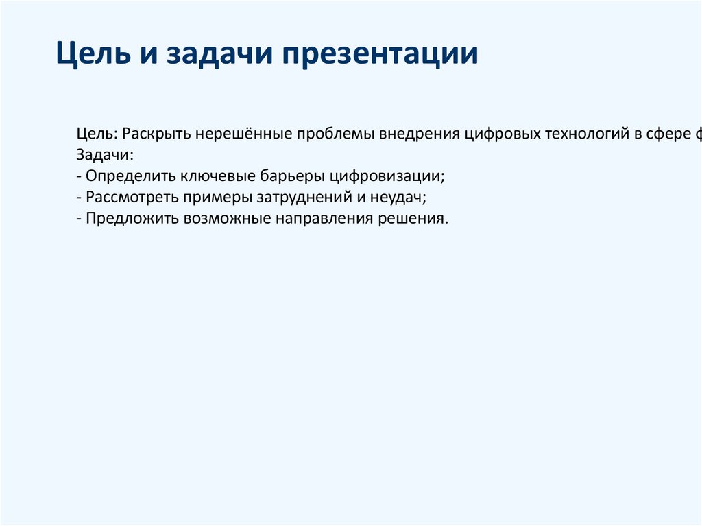 Цель и задачи презентацииЦель: Раскрыть нерешённые проблемы внедрения цифровых технологий в сфере ф