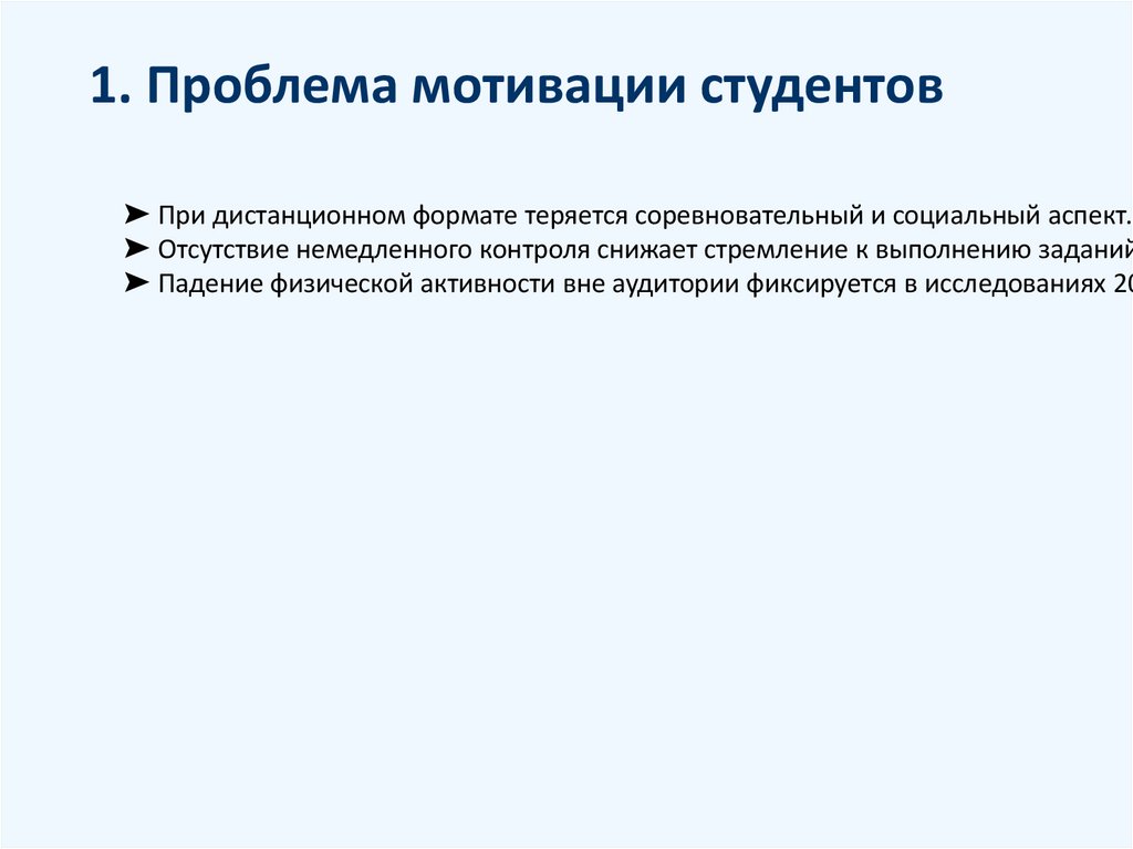 1. Проблема мотивации студентов➤ При дистанционном формате теряется соревновательный и социальный аспект.