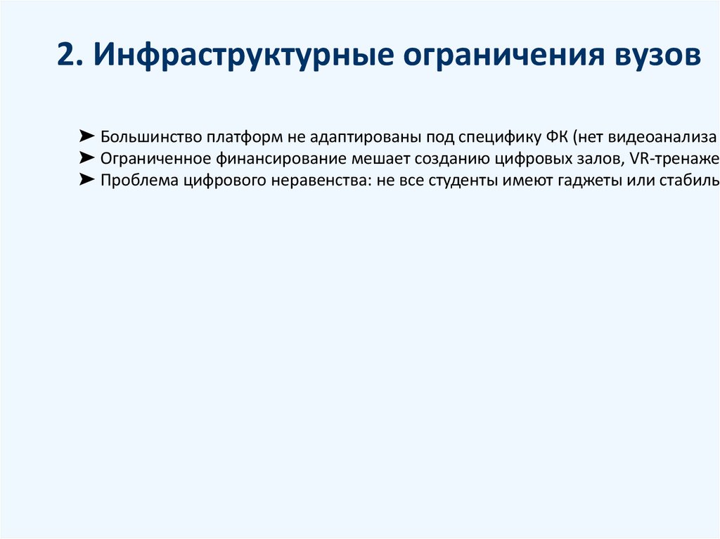 2. Инфраструктурные ограничения вузов➤ Большинство платформ не адаптированы под специфику ФК (нет видеоанализа д