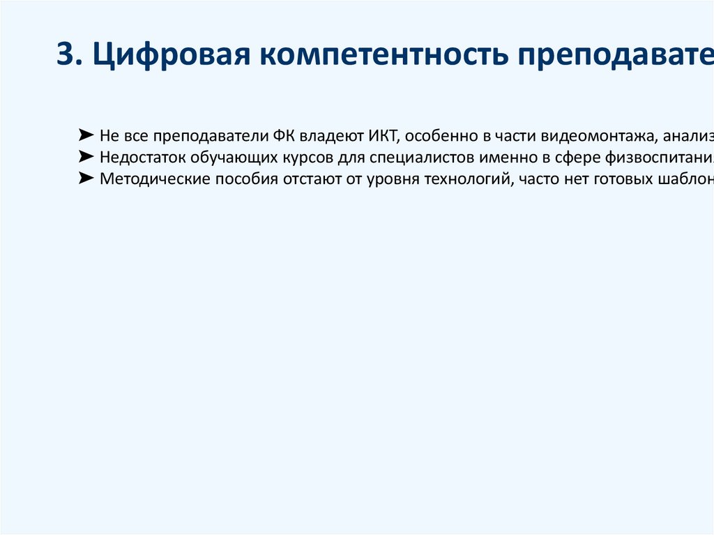 3. Цифровая компетентность преподавате➤ Не все преподаватели ФК владеют ИКТ, особенно в части видеомонтажа, анализ