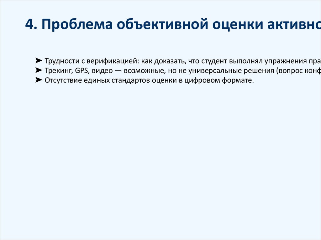 4. Проблема объективной оценки активно➤ Трудности с верификацией: как доказать, что студент выполнял упражнения прав