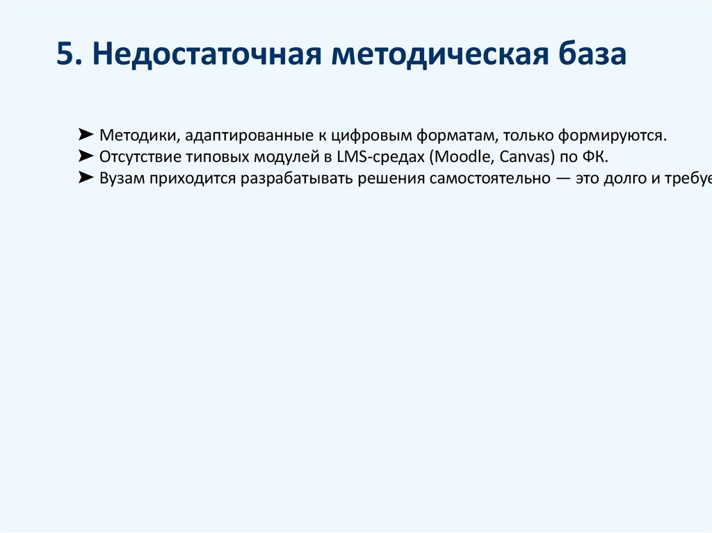 5. Недостаточная методическая база➤ Методики, адаптированные к цифровым форматам, только формируются.
