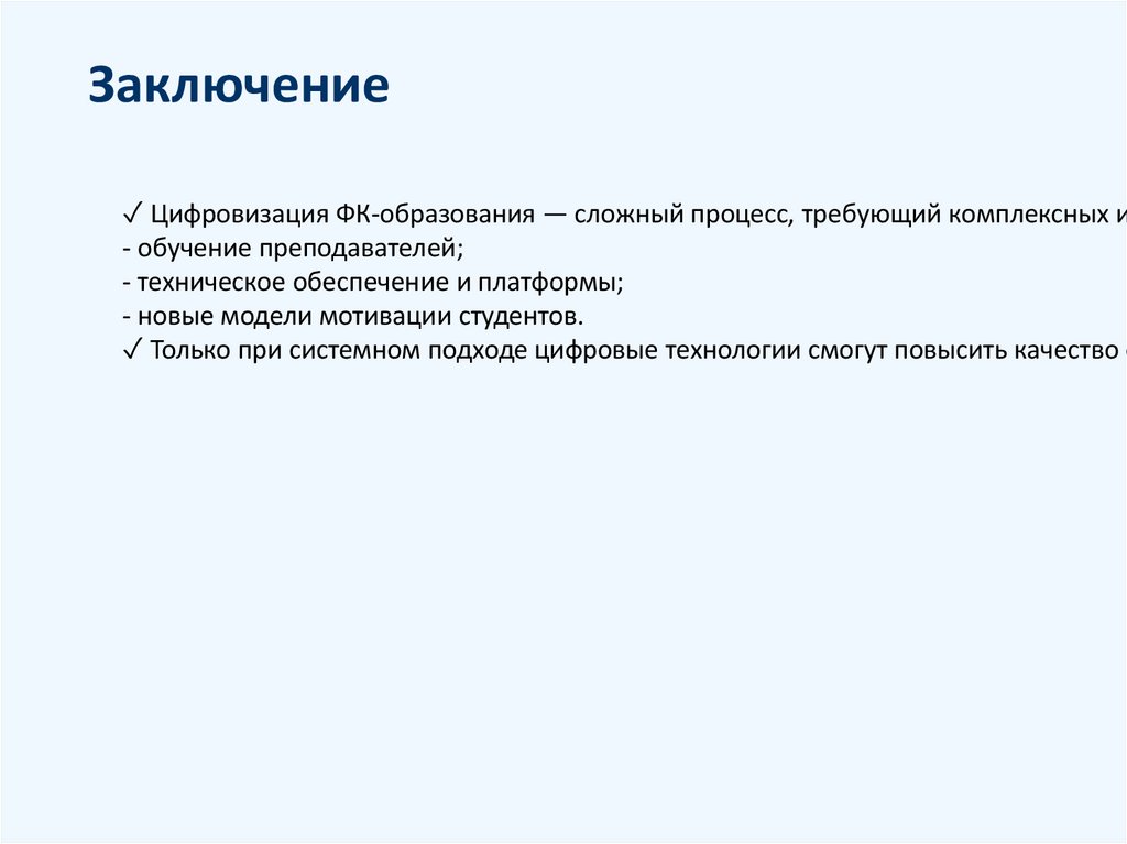 Заключение✓ Цифровизация ФК-образования — сложный процесс, требующий комплексных и