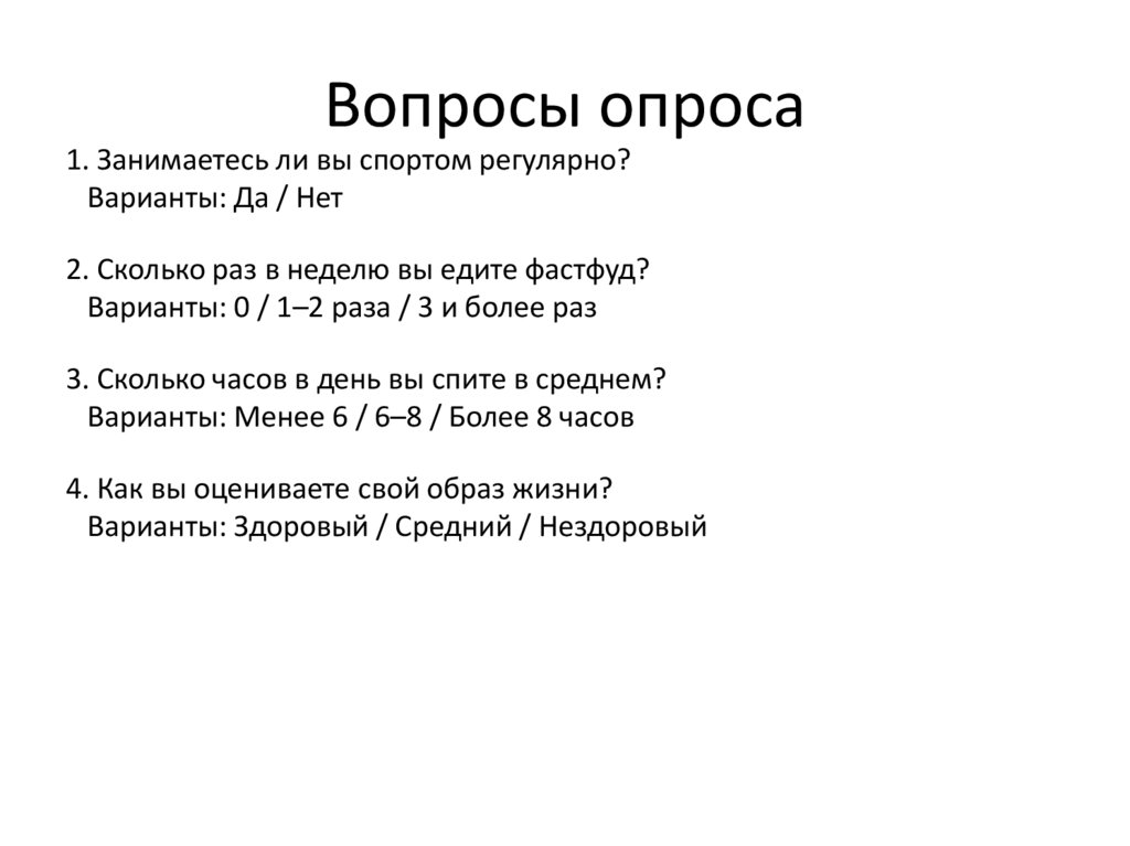 Вопросы опроса1. Занимаетесь ли вы спортом регулярно?