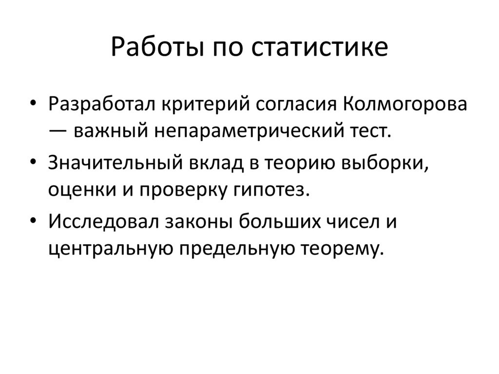 Работы по статистике• Разработал критерий согласия Колмогорова