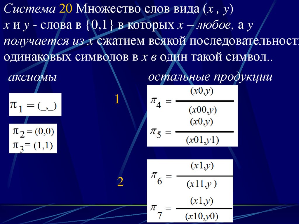 Система 20 Множество слов вида (x , y)x и y - cлова в {0,1} в которых x – любое, а y