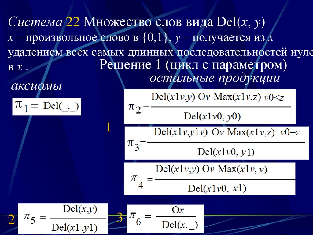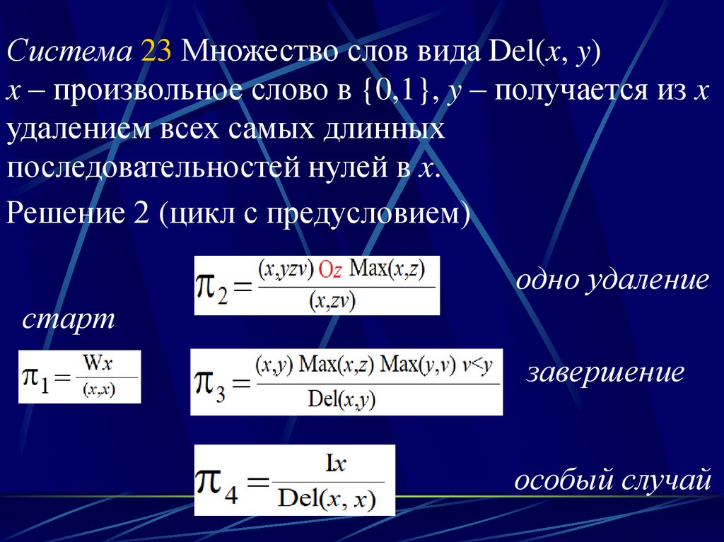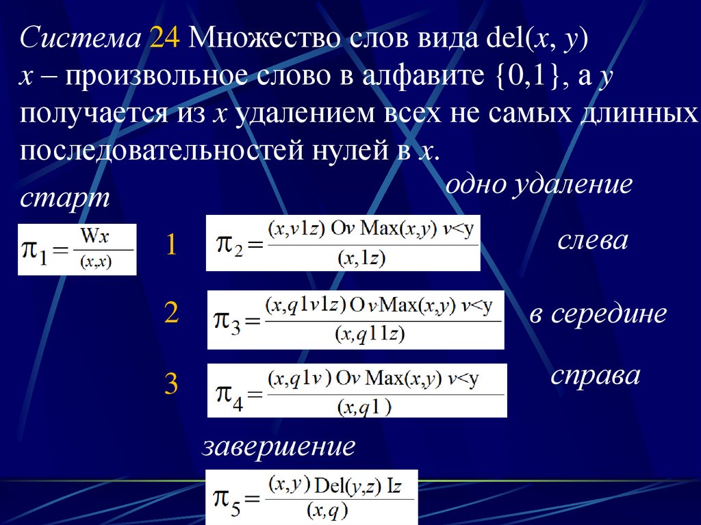 Система 24 Множество слов вида del(x, y)x – произвольное слово в алфавите {0,1}, а y