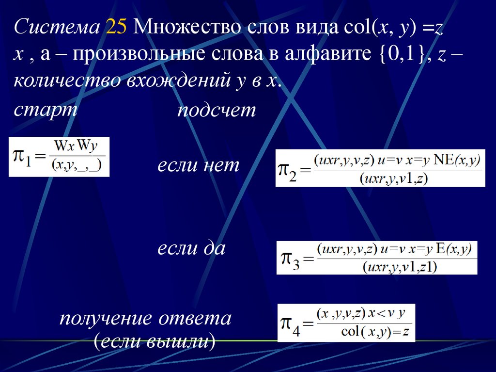Система 25 Множество слов вида col(x, y) =zx , а – произвольные слова в алфавите {0,1}, z –