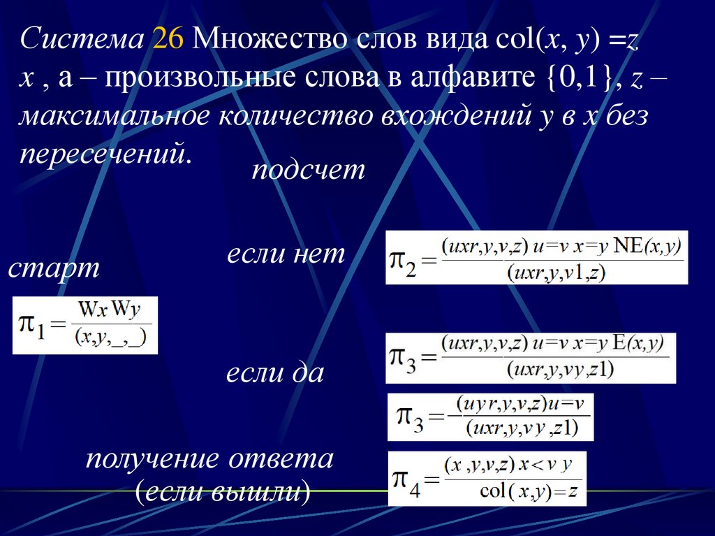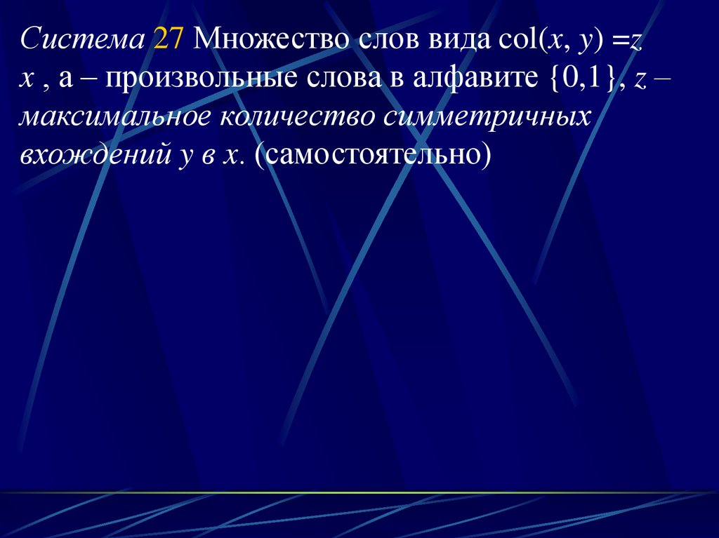 Система 26 Множество слов вида col(x, y) =zx , а – произвольные слова в алфавите {0,1}, z –
