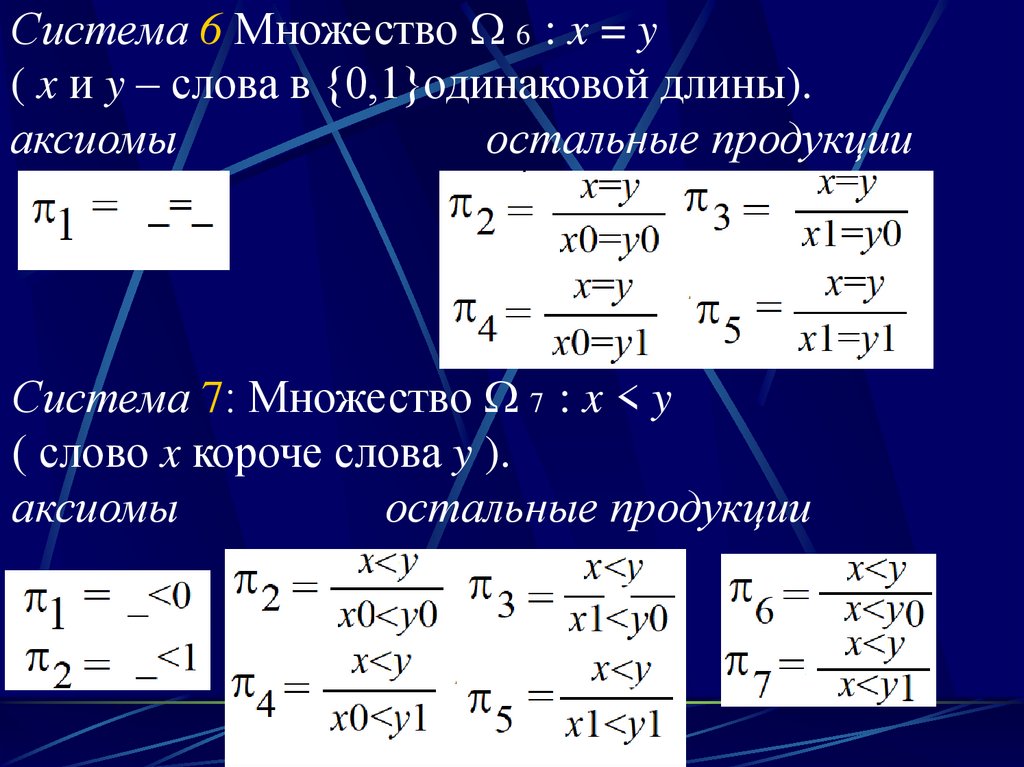 Система 6 Множество 6 : x = y( x и y – слова в {0,1}одинаковой длины).