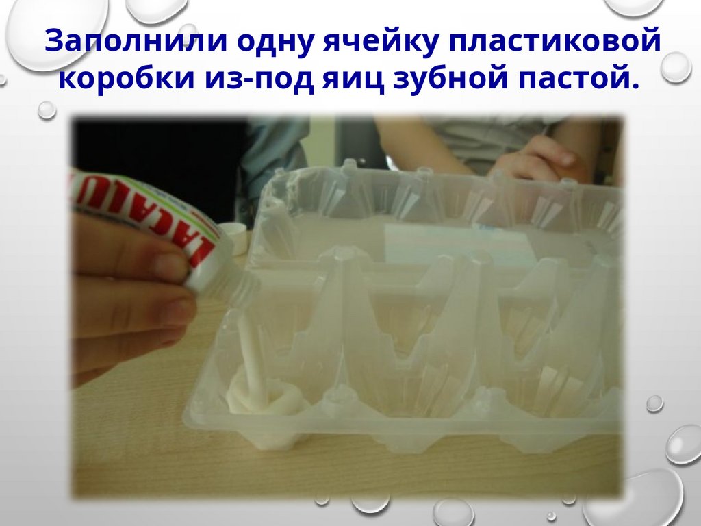 Заполнили одну ячейку пластиковойкоробки из-под яиц зубной пастой.